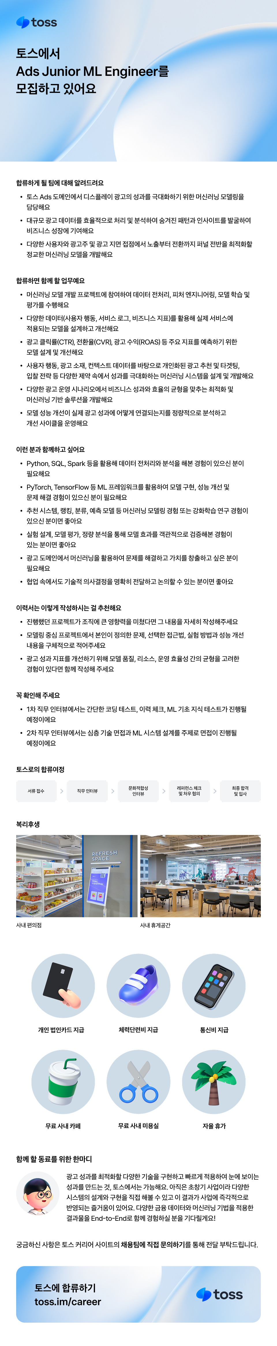 토스 Ads 도메인에서 Junior ML Engineer를 집중 채용하고 있습니다.